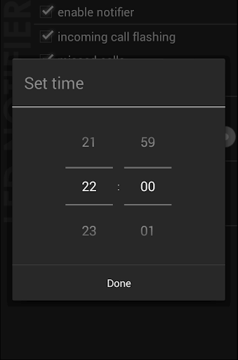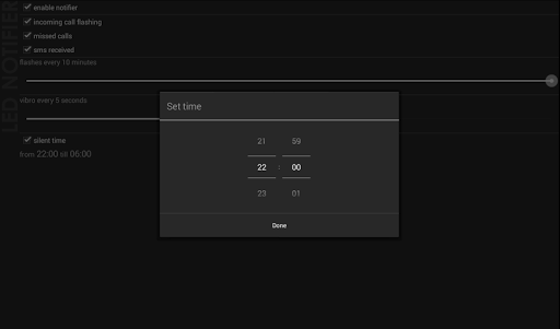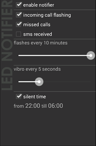 LED from the camera of your phone will alert you of incoming calls, missed calls, received SMS. You can also set up notifications via vibration. Notifications stop as soon as the screen is unlocked. You can configure the silent time, during which the program will not bother you.