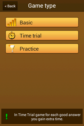 - Time Trial: you start will a initial time amount, which is increased by good answers, each good answer will bring you a specific number of points (stars)