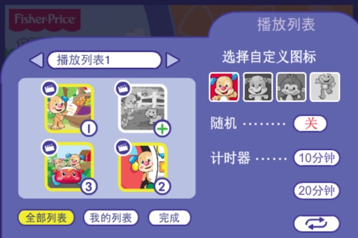 • 自定义播放列表-妈妈可以替宝宝创建最多4个播放列表。选取一个图标来表示播放列表,还可以选择播放时长!