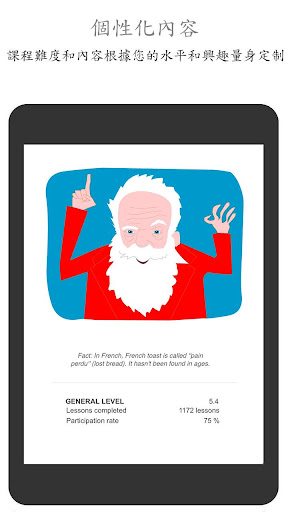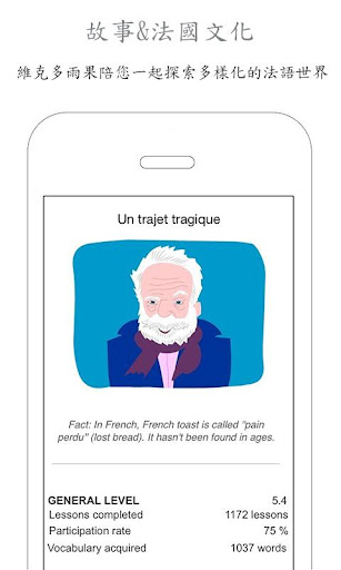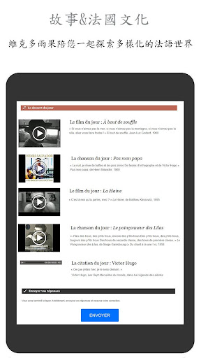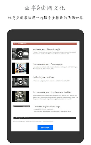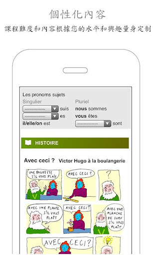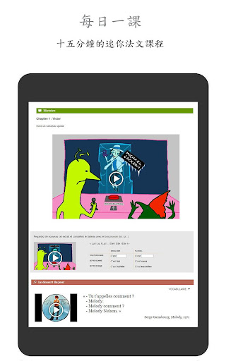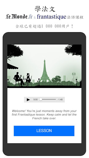 Frantastique 法語課程滿足你對法文的需要與要求,課程也會依照不同的程度而設計。在專業的情境設計下你將會聽到不同的口音、多樣化的練習,幽默的課程讓你在學習中充滿驚喜。你所需要的時間每天只有10到15分鐘!