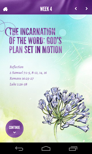 The app includes a reflection for each week of advent as well as Christmas, along with an overview of the Advent season and information about Lectio Divina.