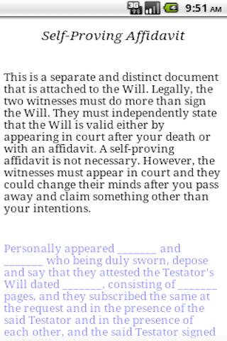 The app is organized into separate pages for each provision along with a sample Will to show how these sections fit together: property, funeral, administrator, and more. Additionally, view some helpful advice on how to format the document to prevent manipulation later.