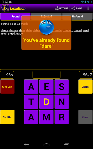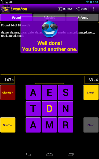 FUN, CHALLENGING, and EASY TO PLAY, Lexathon is the ultra-addictive 9 letter word game for you! From a jumble of 9 letters, discover as many words as possible of 4 or more letters that contain the central letter. Test your lexical skills; there is always a 9 letter word to find amongst the scrambled letters. Be quick and cunning; every word you find gets you more time and increases your score!