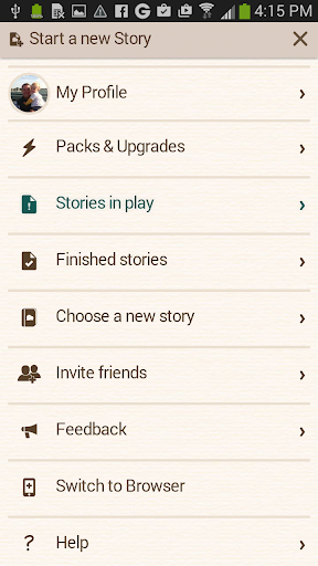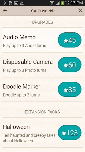 Example: you might get sent a Story from a friend or family member asking you to ad lib a "PERSON", in which case, you could type "the Mad Hatter" and tap Go. Then anybody else can take the next turn. Later, you might have to fill in a doodle or a photo. When all the turns are taken (usually around 15 or so), you get to see the story that you and your friends have written, and usually it's good for some laughter. Along the way, you will have earned some Stars for taking turns or other achievements, and these come in handy later when you want to get more Story Packs and other Upgrades.