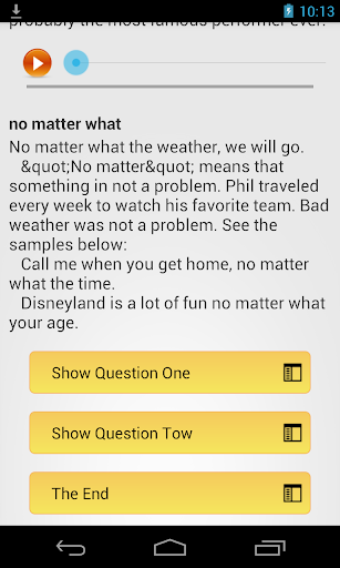 You can use this app to Listen English and Practice everyday. You must dowwnload and listen it later and you can use it offline without network. This application is the best app for listen english and english conversations. You can listen and repeat english in very lession. I hope your english is better and speak english good.