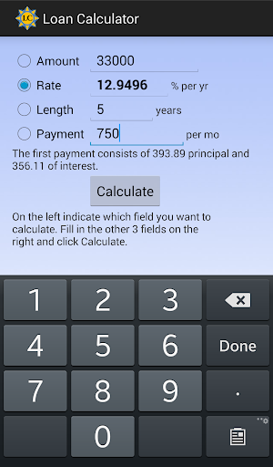 The simple loan calculator for the 4 components of a loan - payment, interest rate, length (period) and principal amount. Provide any 3 of the 4 parts of the loan and the 4th part will be calculated. Loan Calculator is perfect for home mortgage and auto loan calculations. With this loan calculator you can answer questions like: