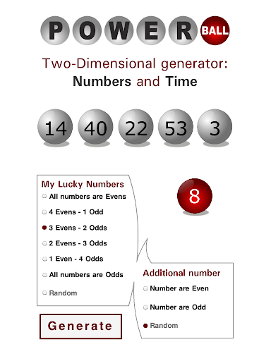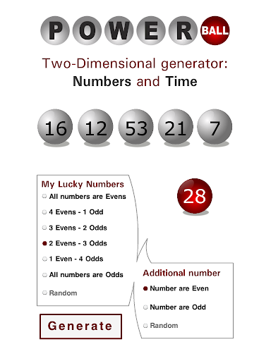 This two-dimensional app generating numbers contains an algorithm, UNIQUE IN THE WORLD that acts like real lottery draws. As in reality, every number is chosen in a certain time. This is how it happens with the app and it generates the time as well as the numbers, being the closest simulation to the real lottery draw.