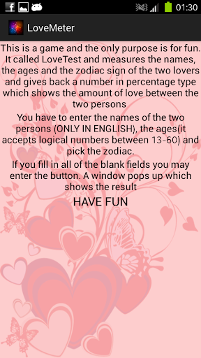 This is a game and the only purpose is for fun. It called LoveTest and measures the names, the ages and the zodiac sign of the two lovers and gives back a number in percentage type which shows the amount of love between the two persons