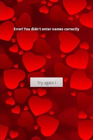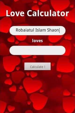Just enter your and your lover's full name in the boxes, click 'Calculate !', and you'll see exactly if you're meant to be together! Please feel free to express your expression about this application. It would be a pleasure to hear you.