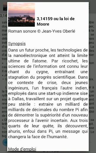 Découvrez le roman original d'un auteur français sous la forme d'un livre sonorisé ! L'application intègre un e-reader qui gère les sons au fur et à mesure de l'avancée dans l'histoire. Plusieurs options permettent de configurer la lecture pour la rendre la plus agréable possible. Et pour les plus pressés, un résumé de chaque chapitre est disponible à la demande !