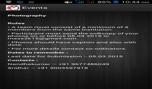 Mass’ 15 is a national level technical symposium conducted by mechanical engineering association (MEA) and SAE an nonprofit engineering and scientific society. MEA was established in the year 2007, a student organization of department of mechanical engineer, IIT Bombay, to maintain a high level interaction between the students and the faculty members. This particular application helps you to register yourself to the national level symposium.