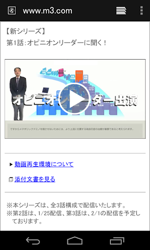 医療専門サイト「m3.com」で最新の医療情報、医薬品情報を配信する『MR君』がアプリで登場。通勤途中や移動の時間など場所を選ばず、いつでもどこでもコンテンツやメッセージを視聴できます。
