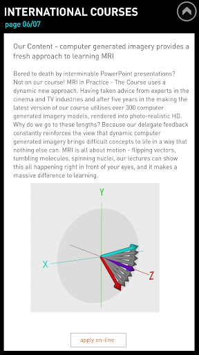 The presentation featured in the app, is fully narrated by "MRI in Practice" author and eLearning expert John Talbot, and features plenty of animated graphics and computer generated imagery that help to bring difficult concepts to life in a way that cannot be achieved on a flat page or slide presentation. The app works brilliantly as a stand-alone learning aid, but is designed to mesh seamlessly with our other learning materials, the MRI in Practice textbook and the live course. This is unique in the field of MRI education, and provides the user with a rich learning environment where complex topics are approached from different angles in each medium.