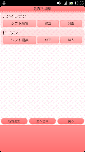 勤務先が登録できたら「シフト編集」ボタンをタップし、遷移先画面で「新規追加」ボタンをタップしてシフトパターンを登録してください。複数登録が可能です。