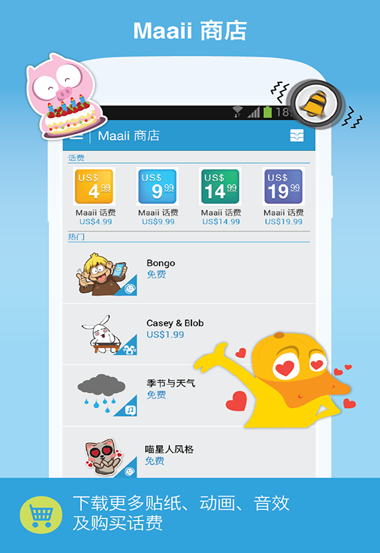 Maaii是一款结合语音通话、消息聊天及融合社交网络的免费移动通讯应用。您可以下载更多趣味贴图、动画及音效丰富聊天体验,还可以建立个性来电显示视频以及分享照片、音乐、影片以及更多!通过MaaiiOut您还能以超低费率致电世界各地非Maaii用户的固话或手机号码!Maaii的用户遍及200多个国家,曾在泰国、马来西亚、新加坡、台湾、埃及、香港等11个国家荣登通讯应用排行榜前十名!**********功能和特点**********?高品质免费网络电话,世界顶级的IP语音引擎保证电话质量,和小伙伴们一起使用Maaii免费畅聊每一天(仅消耗网络流量,建议开通3G流量套餐或在Wi-Fi下使用)?MaaiiOut可致电全球多个国家/地区的固话和手机,资费低到超乎想象,节省高达98%话费#。邀请好友注册亦可获取话费奖励(可登录官网查询费率和充值)?新增应用内购买Maaii话费?更多趣味贴图、动画及搞怪音效可在Maaii商店下载?新增特色功能MaaiiMe,定制您的来电视频?电话没接通?可以一键语音和视频留言?网络不给力?不方便通电话?没关系!Maaii同样可以免费收发文字、语音、表情、图片、视频消息"?限时消息:分享“阅后即焚”的恶搞、逭铡⑺矫苷眨对方最多只能查看10秒就自动消失?通过iTunes和优酷(非中国大陆地区用户为YouTube)分享音乐及视频?分享照片、位置、语音消息和影片?通过位置、个人识别码及系统推荐查找朋友?与好友即时进行群组聊天现支持11种语言:英文、中文繁体、中文简体、韩文、日文、西班牙文、法文、阿拉伯文、泰文、印尼文、越南文。#可致电全球超过60个国家/地区(节省的话费根据标准国际长途电话资费计算)*安b需求:Maaii支持符合以下规格的设备:中央处理器>=600MHz.内存>=512MB操作系统>=安卓2.3.3–2.3.7及4.0或以上分辨率规格:16:9、16:10、4:3可用炔看娲⒖占>=150MB*请参考www.maaii.com的客户服务部分有关支持设备的完整列表。**********知名媒体对Maaii的评价**********“Maaii犹如一款为移动设备开发的Skype,因此我认为非常值得下载试用”-TheNextWeb“Maaii的加入让聊天应用战场的竞争更加激烈”-TechinAsia“Maaii是最顶尖的语音通话应用”-Technode“在目前流行的VoIP网络电话中,Maaii是一绝佳选择”-UKMobileReview**********我们期待您的意见和反馈**********如果您喜欢Maaii请给我们好评。我们更期待听到您好的意见和建议,或者有任何疑问都请通过邮件team@maaii.com或在新浪微博http://weibo.com/u/2597549297联系我们。