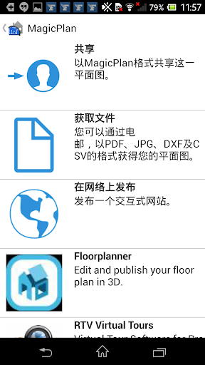 之后您可以与MagicPlan的用户免费分享您的平面图,或者通过付费获取PDF、JPG、PNG、SVG、DXF及CSV格式文件,并以交互式网页的形式进行发布。