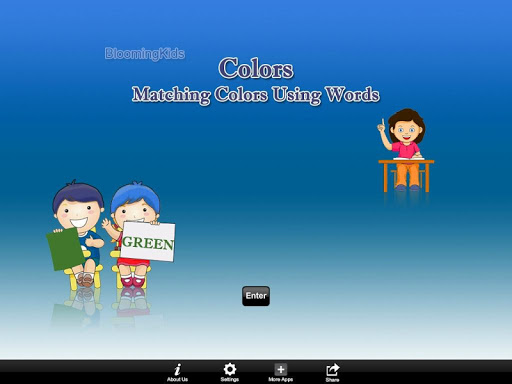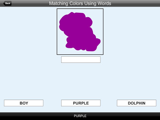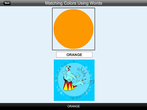 This app "Matching Colors Using Words" teaches the student to match colors with words (names of the color). Here a color is shown at the top of the screen. The app tells the student to "Match Black" or whatever color is shown at the top of the screen. Then the student is required to click on the matching color word shown among others at the bottom of the screen.