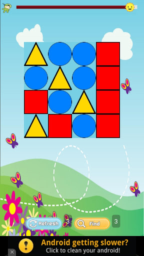 Matching Same Shapes also has an exciting feature that makes it more thrilling than just another matching game- you have to find the shapes that connect together in some way! When a linked match is made, Matching Same Shapes will show the link between the shapes. There are also help buttons at the bottom of the screen. The REFRESH button jumbles up the shapes so it will be easier to locate linking matches. There is also the FIND button which will find a matching link for you. The REFRESH and FIND buttons have a number next to them which shows you how many times you can use it; the usage is 3 times each.