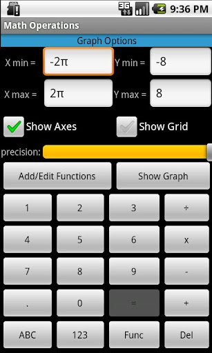 This application performs math operations such as evaluating functions with or without variables, the quadratic formula, simplifying square roots, solving derivatives, converting between bases, and graphing