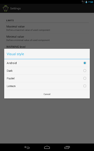 - Nastavenie grafickej témy pre zobrazenie komponentov. K dispozícii sú 4 témy: Android, Dark, Pastel a Citrus