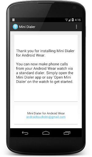 Mini Dialer is a phone dialer that allows you to initiate phone calls from your Android Wear watch.