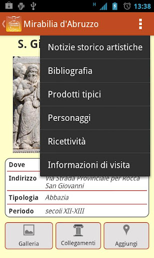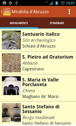 The App, in Italian and English, gives a census of forty Cultural Properties of the Abruzzo Region, outlining for each a road map, tourist/visiting information, historical-artistic information, a photo gallery, hotel availability, restaurants, farm holiday resorts, and typical local products. It represents a factual guide and is a valid and useful tool to promote the territory and its operators. Also, through hyper-textual connections, the user may be able to organize a personal theme itinerary.