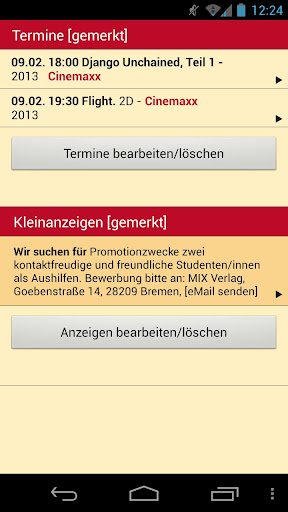 Haben Sie Lust auf ein wenig Flirten und/oder sind Sie auf »ernsthafter« Partnersuche? Dann blättern Sie fix durch die Kleinanzeigen, denn hier warten z.B. Singles bei den Kontaktanzeigen auf ein Dating. Vielleicht finden Sie auch den lang ersehnten Traumpartner, wer weiß das schon?! Oder stöbern Sie nach einem kuschelig-neuen Zuhause, »ein Klavier, ein Klavier«, einem Malkurs, einem neuen Job, oder, oder ... Bei den Anzeigen läuft es genauso komfortabel wie bei den Terminen - sobald z.B. eine Telefonnummer oder Website erkannt wird, gibt es die Möglichkeit der direkten Kontaktaufnahme. Bilder können hierfür vom Smartphone hochgeladen und mitgesendet werden. Interessante Kleinanzeigen können einfach in der App-Merkliste gespeichert sowie an gute Freunde weitergeleitet werden. Auch hier finden Sie eine komfortable Textsuche, falls Sie ein spezielles Inserat finden möchten.