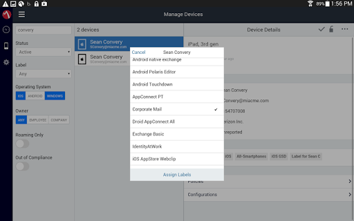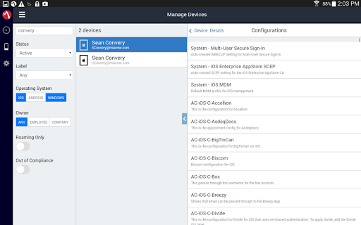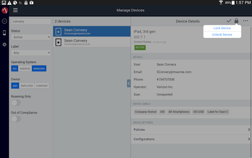 • Ability to perform administrative actions instantly on user devices, including device check-in, device lock, label management, and device retirement.