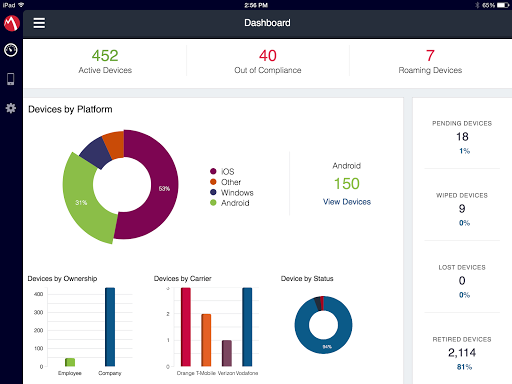 • Device listings by status, including devices marked lost, out-of-compliance, roaming, wiped, and pending enrollment.