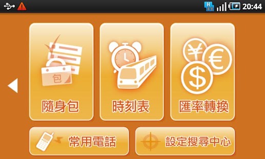 隨身包、時刻表、匯率轉換、常用電話、設定搜尋中心