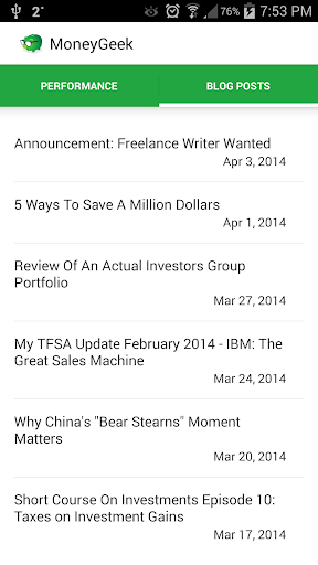 Tracks the performance of MoneyGeek's model portfolios and also helps you read the latest blog posts from MoneyGeek from your Android device.