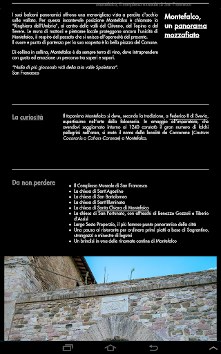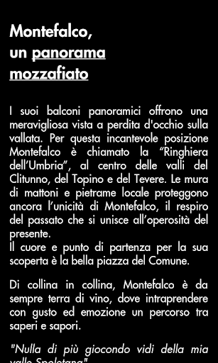 I suoi balconi panoramici offrono una meravigliosa vista a perdita d'occhio, per l’incantevole posizione al centro delle valli del Clitunno, del Topino e del Tevere. Le mura di mattoni e pietrame locale proteggono ancora l’unicità di Montefalco, il respiro del passato che si unisce all’operosità del presente. Il cuore e punto di partenza per la sua scoperta è la bella piazza del Comune.