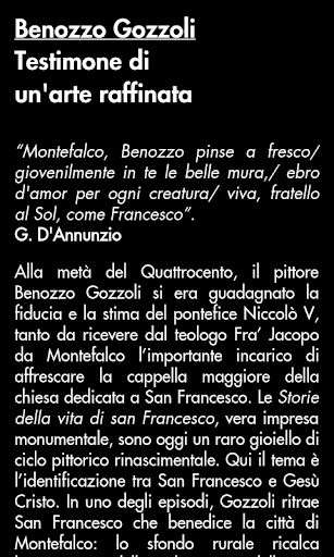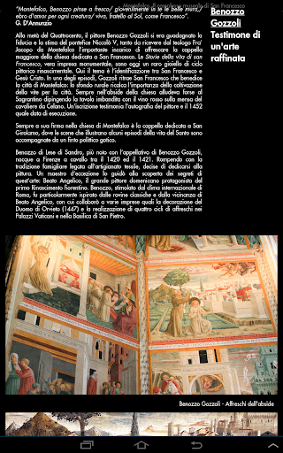Cuore del Complesso è la Chiesa di San Francesco, con gli splendidi affreschi di Benozzo Gozzoli, autore delle decorazioni della cappella di San Girolamo e di quelle dell'abside. Le sue Storie della vita di san Francesco (1452) sono tra i più importanti cicli rinascimentali conservati. Attorno a questo centro pulsante si dispongono, lungo il percorso, preziose raccolte d’arte: la pinacoteca, la cripta con le antiche cantine dei frati minori, la sezione dei reperti archeologici e frammenti lapidei ed, infine, gli spazi dedicati alle mostre d’arte contemporanea.