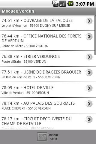 - Affichage automatique de la page d'informations du P.I. le plus proche lorsqu'on est à moins de 40 mètres (distance réglable) avec notification sonore. Si vous gardez votre téléphone dans la poche, il vous avertira à l'approche d'un site intéressant (P.I.).