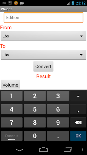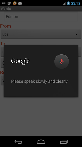 In addition to the tactile, users of this application can also speak, shake, orient and be close to the phone in order to give input commands. To give the converting value, they can write it using touch keyboard or press the down volume button and then say it if they want to avoid touching the screen. Similarly, they can touch the button “Convert” or shake the phone to get the result. Finally, to change the current activity they can touch the button (volume or weight) or orient the phone ("up" to go from Volume activity to the Weight activity and "Down" for the reverse) while being physically close to it (covering the proximity sensor). In output, the system in turn displays the conversion results.