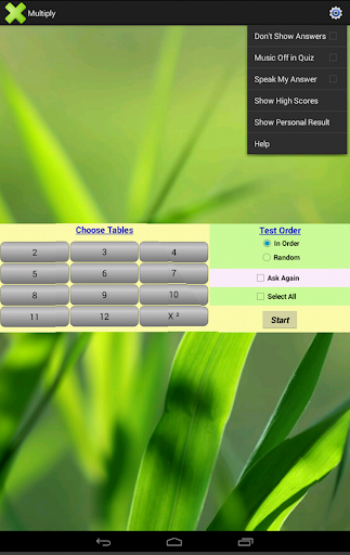 Master 2 through 12 multiplication tables and the squares table with this engaging, interactive game. A beginner can learn the multiplication table one at a time, while a more proficient player can test his skills by answering random questions from all 12 tables, a skill all children need to master in third grade. In addition, the square table tests you on squares from 1 x 1 to 25 x 25, a skill required for 7th grade. Want to strengthen weak areas? Simply select “Ask Again” option to repeat those questions that you missed.