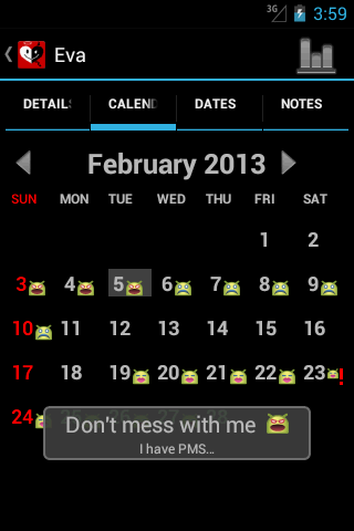 Does the world of women look to you like chaos? With this application you might get a glimpse into this chaos, and a feeling that you somehow understand what is going on with your girlfriends, or with your wife. All you have to do to start is to enter two period dates of your girlfriend and you will get the first mood information and mood predictions for each day in the next months. Would she like to get a baby, is live o.k., or maybe it is better to shut up and say nothing because of her PMS? Women love when we know when the next period is coming. This application is a must for every guy - ideal for planing romantic dates, vacations or just to know what is going on with the woman you think you know.