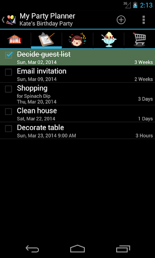 My Party Planner helps you to plan parties and events. It has four sections: "TO DO", "Guest", "Menu" and "Shopping" in addition to general information. It automatically sorts TO DOs by due date/time. It allows you to import guests from contacts on your phone and manage RSVPs. User can search recipes on the Internet and save the url for future reference. While planning the menu, user can enter to-do and shopping items for a specific dish. So on the to-do list or shopping List, user can easily see which dish the item is for.