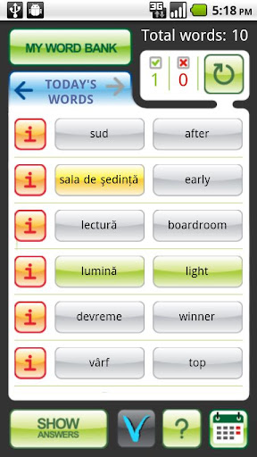 Rapidly build your vocabulary and perfect your pronunciation! MyWords is a completely new way to quickly learn and remember 10 vocabulary words a day. The fast pace at which you will master new words, with proper pronunciation, will absolutely amaze your friends, colleagues, teachers and family.