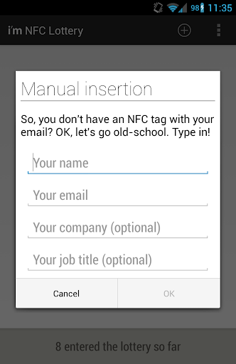 * Supports both manual participant data input and quick, NFC-based participant entry (ideal, for example, at conferences where each attendant has an NFC-enabled badge)