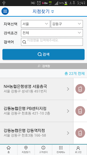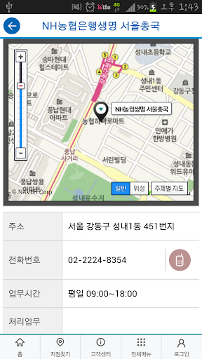 농협생명의 다양한 보험서비스 (보험계약조회, 보험계약관리, 입출금서비스, 대출서비스 등)를 이용하실 수 있으며, 고객님의 편리성을 도모하고자 “지점찾기” 및 “고객센터연결하기”를 설치하였습니다.