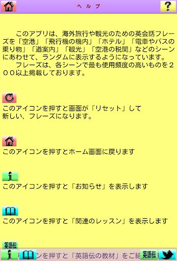 海外旅行、観光や出張のための英会話フレーズを「空港」「飛行機の機内」「ホテル」「電車やバスの乗り物」「道案内」「観光」「空港の税関」などのシーンにあわせて、ランダムに表示するようになっています。