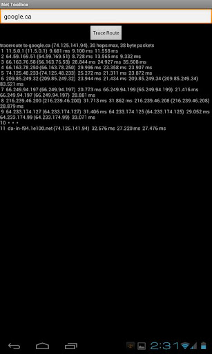 Net Toolbox is a collection of tools for computer networking enthusiasts and professionals alike. It features a tool to check if your favourite websites are online, a tool to check if your ports are open, a tool to find information about your network (ip,ssid, signal strength, mac address, netmask, dns, link speed and gateway) a tool to ping other devices, a whois search tool and a traceroute tool that is only available to those with rooted devices.
