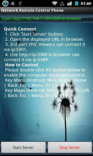 Click ¡°start server¡± button to start this free app. You will get a YRL on the top of this app. Open the displayed URL in java-supported browser. As for3rd-part VNC Viewers, you can connect it via IP: 5901. In this way double click Alt button can enable the computer keyboard control.