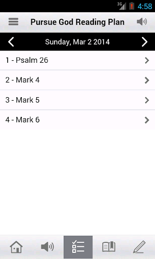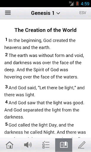 * Free Audio Bible: Click listen and you are instantly listening to the daily devotional plan. You can also look up any passage you want, the listen tab is in the bottom right hand corner at all times.