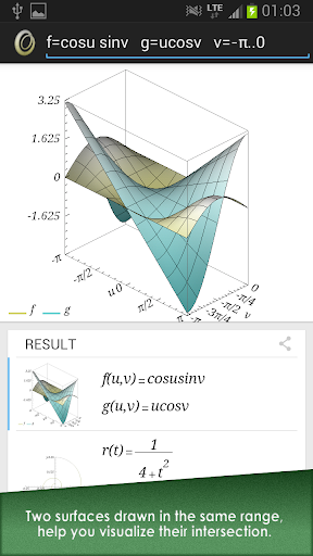 Newton Math Graph produces beautiful graph of 2D curve and 3D surface by math input like handwriting. With our innovative parser, math syntax is as simple as when you write it on your note. 2D or 3D graph is recognized automatically by number of unknown variables, through our powerful symbolic math engine. After plotting, you can find function roots, track coordinates, pan or zoom 2D graph, zoom or rotate 3D graph to view from all angles seamlessly by hand gesture.