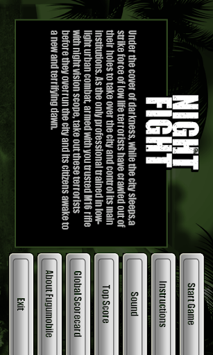 Night Fight: Under the cover of darkness, while the city sleeps, a strike force of low life terrorists have crawled out of their holes to take over the city and control its main institutions. As the only professional trained in low-light urban combat, armed with your trusted M16 rifle with night vision scope, take out these terrorists before they overrun the city and its citizens awake to a new and terrifying dawn.