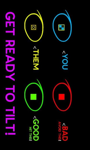 Tilt the device to make the blue and black square hit the yellow squares, if you see a red square, do not hit it, if you see a green square DO hit it, the rest you will need to work out for yourself :)