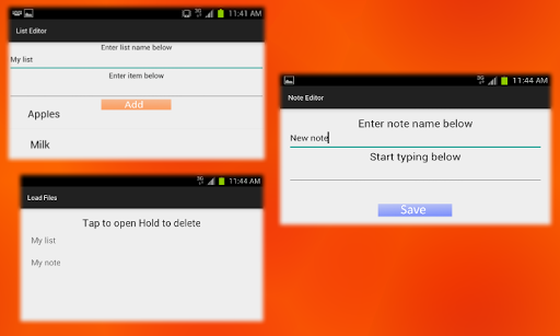 You can make notes on the notepad and lists very easily just by the click of a button. Make lists and notes with an easy and simple user interface. See all your notes and lists in the "My files" section of the app accessed from the main screen. easily convert a list to a note or a note to a list.