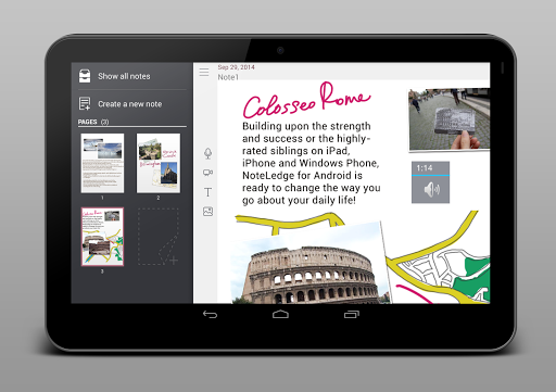 NoteLedge結合手寫、文字輸入、圖片張貼、錄影、錄音等多項功能於一身,以最直覺簡單的方式,紀錄生活中的點點滴滴。有了NoteLedge,您的平板電腦可隨時搖身一變成為記錄生活的好幫手,不論是作為剪貼簿、相冊、備忘錄、日記本、旅遊日誌、影音收藏櫃、或會議記錄本,NoteLedge讓您輕輕鬆鬆Hold住各種場合。此外,利用無線網路,NoteLedge能讓您隨時隨地的分享生活點滴和創意思維,大幅提升您事業、學業、生活中的效能與樂趣。